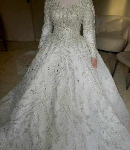 فستان زفاف ساحر بتصميم مستوحى من الحكايات الخيالية، يتميز بتطريز لامع وذيل طويل يمنحكِ إطلالة أسطورية في ليلة العمر.